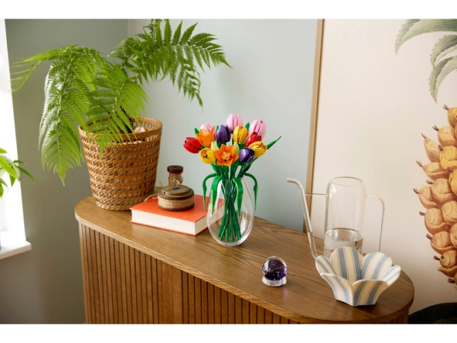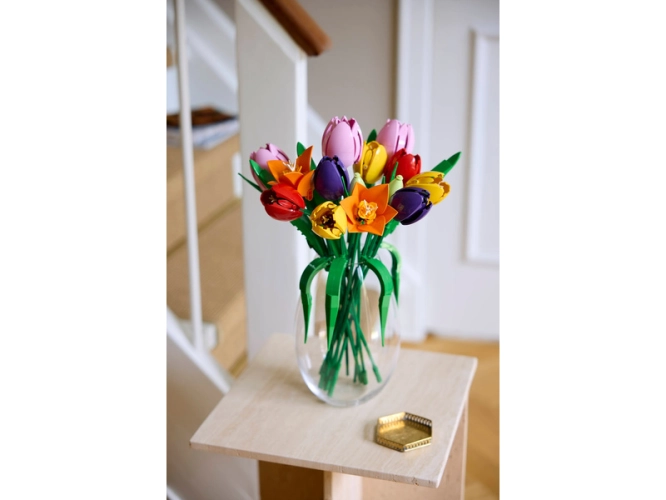 Stavebnice také obsahuje nastavitelné stonky, díky kterým lze tulipány snadno naaranžovat do originální kytice LEGO. Jakmile tento zábavný a kreativní projekt dokončíte, model poslouží jako nádherná květinová dekorace do domácnosti, která rozzáří každou místnost.