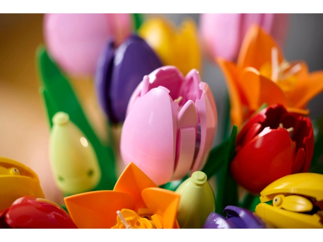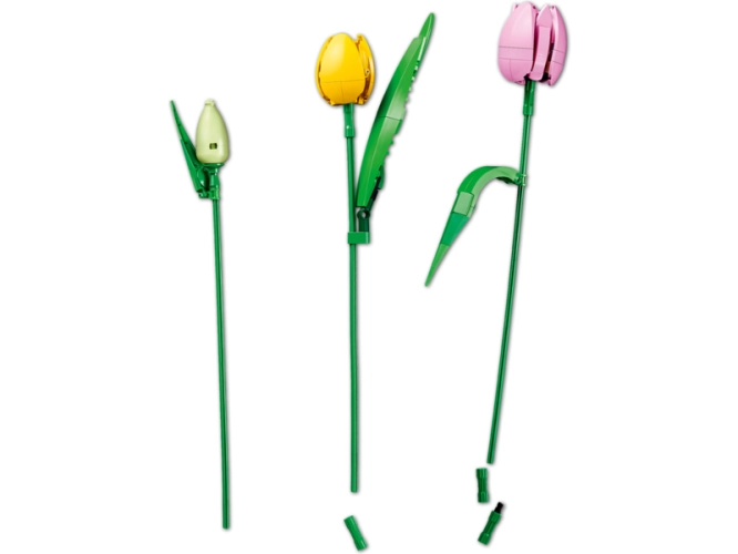- 5 TULIPÁNŮ LEGO® – Kytice obsahuje 5 druhů tulipánů v různých barvách a fázích rozkvětu: součástí jsou zelená poupata, fialové uzavřené tulipány a červené, žluté a růžové rozkvetlé tulipány