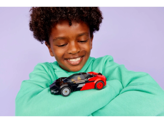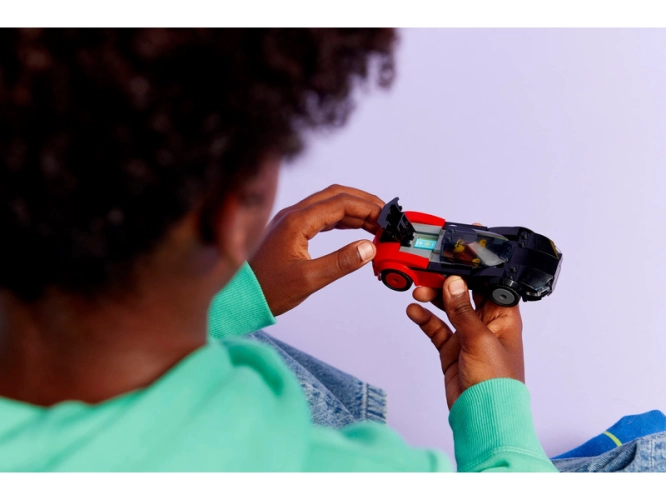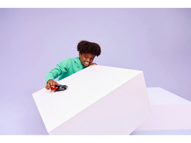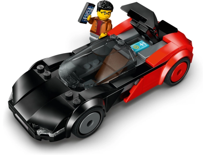 - JAKO SKUTEČNÉ AUTO – Zvedněte zadní kapotu malého černo-červeného sportovního auta, abyste se dostali k baterii, posaďte minifigurku řidiče za volant, šlápněte na plyn a užijte si hodiny jízdy
