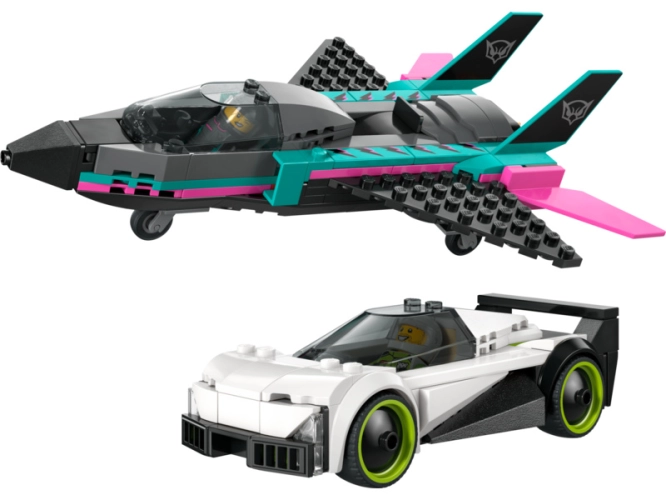 Dvojitá stavebnice LEGO® City Tryskáč vs. auto (60489) obsahuje elegantní supersportovní auto a nadzvukové letadlo, se kterými si malí stavitelé užijí hodiny závodění. Model tryskáče má křídla se šípovitým profilem, dvojitá vertikální křidélka a stabilizátory. Děti můžou zapnout přídavné spalování tryskáče posunutím páčky a otevřít kokpit supersportovního auta, aby si prohlédly propracovaný interiér se závodním sedadlem. Usaďte minifigurky pilota a závodního řidiče a odstartujte strhující závody.