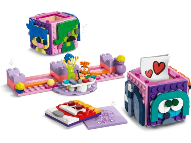 - Sestavitelné kostky nálad – Součástí této kreativní stavebnice jsou 2 kostky nálad, 9 vyměnitelných podložek s náladami, podstavec a minipanenky LEGO® ǀ Disney Radost a Úzkost od Pixaru