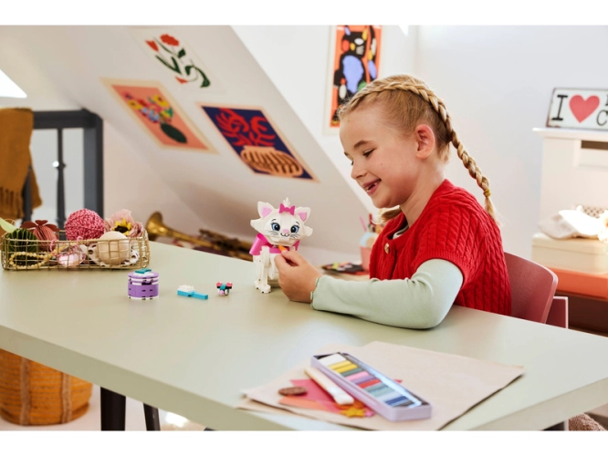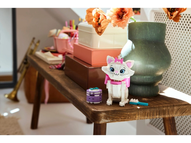 - MODEL KOČKY Z KOSTEK NA HRANÍ I NA VÝSTAVKU – Součástí je pohyblivý model kočky Marie z Disney filmu Aristokočky, dárková krabička, mašle a další doplňky, která se skvěle hodí na hraní i na vystavení v pokoji