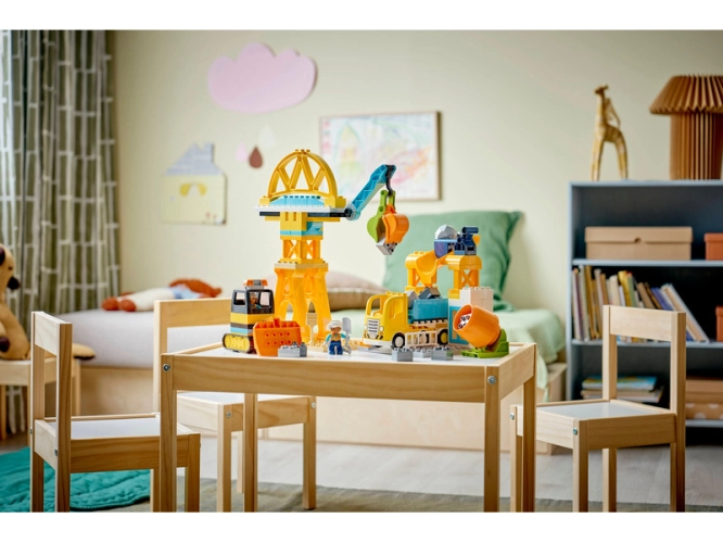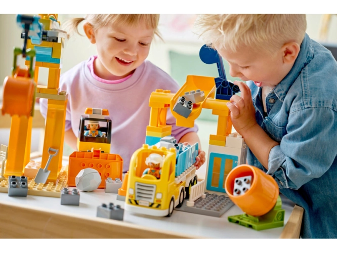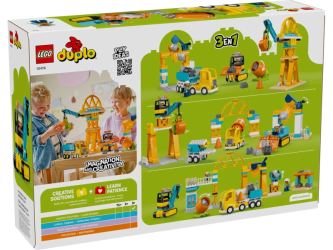 Představte malým stavitelům hračku Staveniště a vozidla 3 v 1 (10476), se kterou stavění nikdy nekončí! Stavitelé od 3 let si užijí budou vtaženi do hry na rušném staveništi, kde si vyzkouší nakládání a vykládání materiálu, stejně jako zvedání a přemisťování kamení a kostek pomocí celé řady stavebních vozidel LEGO® DUPLO®. Děti si mohou postavit buldozer se zvedací lžicí, sklápěcí náklaďák, míchačku na beton s otočným bubnem a jeřáb s pohyblivým ramenem a otevíracím drapákem.
