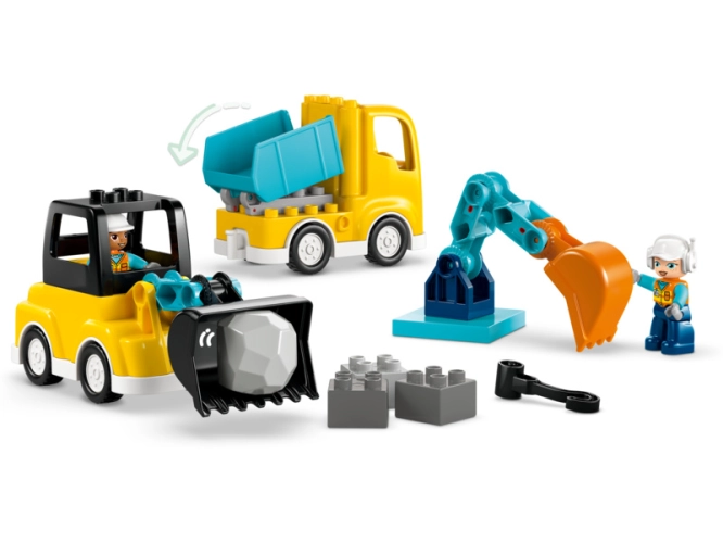 Nastartujte kreativitu svých ratolestí se stavebnicí LEGO® DUPLO® Město Vozidla na stavbě 3 v 1 (10475), která představuje skvělý dárek pro děti od 2 let. Děti si užijí velkou porci zábavy při skládání a přestavování hned 6 různých variant vozidel. Z 22 kostek této stavebnice LEGO DUPLO lze sestavit hned 3 páry vozidel: nakladač s výklopnou lžící, který do sklápěče naloží kostky, bagr a odtahový vůz s otočným ramenem, nebo zvedák a druhý odtahový vůz s malým hákem pro zvedání kostek.