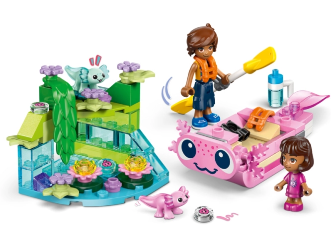 Děti si užijí velkou porci zábavy se člunem, který zdobí usmívající se přátelský obličej axolotla a kmitající ocas. Součástí jsou také sedátka pro postavičky, vesla a 2 záchranné vesty. Připojitelný menší model je zdoben rostlinami, květinami a kostkami v podobě vody, aby děti mohly vytvořit přirozené prostředí pro axolotly.
