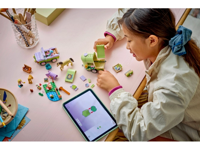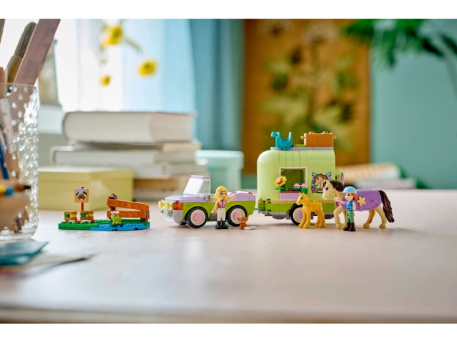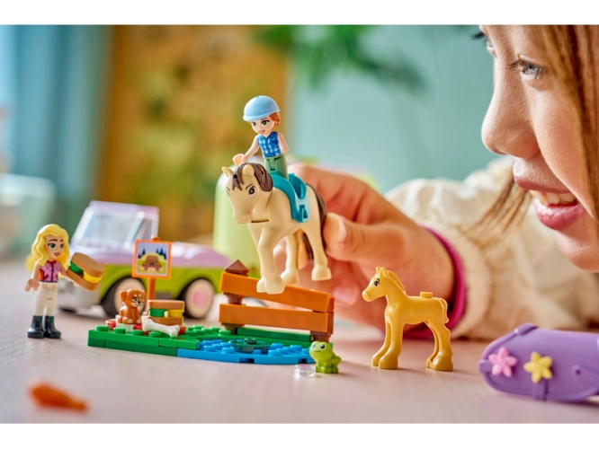 Děti od 7 let si se stavebnicí LEGO® Friends Přívěs s koněm a hříbětem (42695) užijí hodiny hraní na péči o zvířata. Tato stavebnice pro milovníky koní obsahuje 2 minipanenky a figurku koně, hříběte, štěněte a žáby. Vyzkoušejte si péči o zvířata s pomocí propracovaných doplňků pro hřebelcování koní, přepravu v přívěsu a skákání přes překážky.
