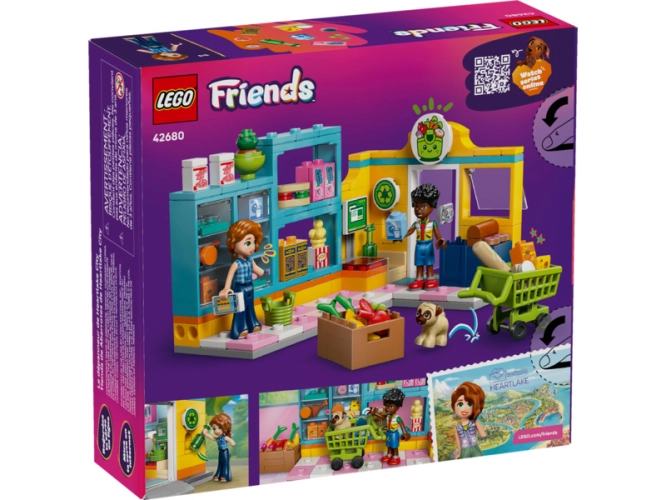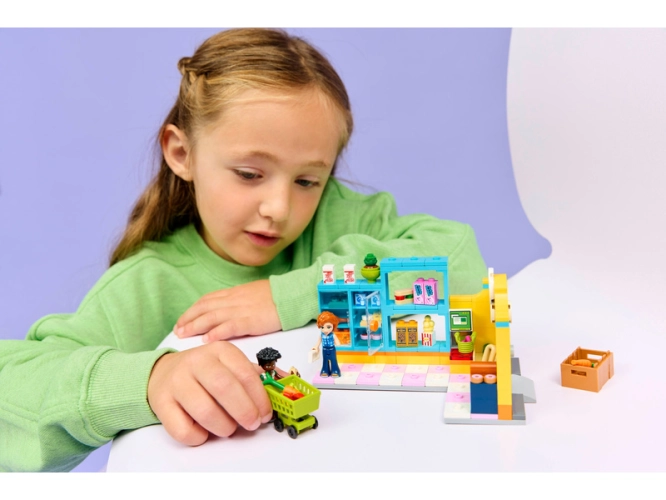 - HRAJTE SI NA NÁKUP – Se stavebnicí LEGO® Friends Samoobsluha v městečku Heartlake(42680) si děti zahrají na zábavné výlety do minimarketu, doplní regály, nakoupí, zaplatí za zboží a recyklují láhev