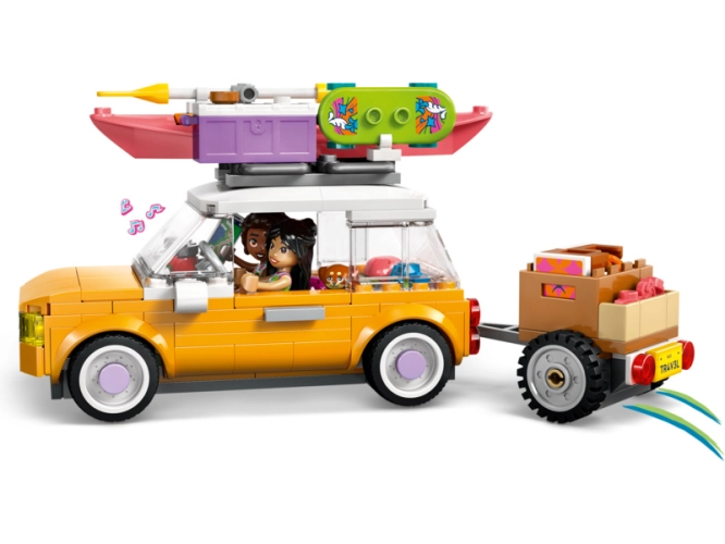 Vydejte se s dětmi na kreativní cestu a pomozte Liann a Aliye naložit do auta a odnímatelného přívěsu vše, co potřebují na cestu. Kamarádky sedí vepředu – vzadu v autě je sedadlo pro pejska Airu. Mezi doplňky najdete kajak, 2 helmy, skateboard, kolečkové brusle, 2 židle a chladicí box se sendvičem, donutem, sušenkou, třešněmi a pamlsky pro psa. Až přijde čas na svačinu, chladicí box poslouží i jako piknikový stůl.