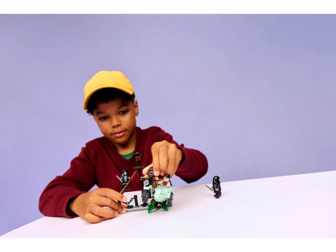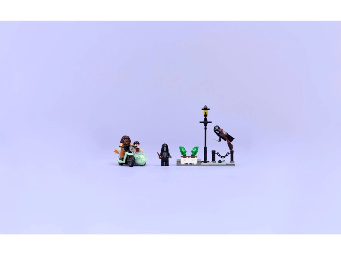 Součástí je první model LEGO Hagridovy létající motorky v měřítku minifigurek, 4 minifigurky LEGO Harry Potter™ a miniaturní scénu Zobí ulice, která inspiruje ke kreativnímu hraní. Usaďte minifigurku Rubeuse Hagrida na motorku a Harryho Pottera do postranního vozíku. Umístěte 2 minifigurky Smrtijedů do scény Zobí ulice, kde najdete také lampu a květináč, který lze během odvážného útěku hrdinů převrátit.