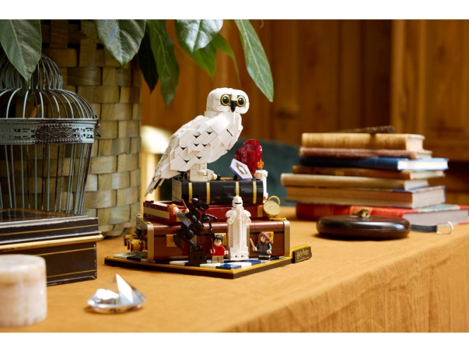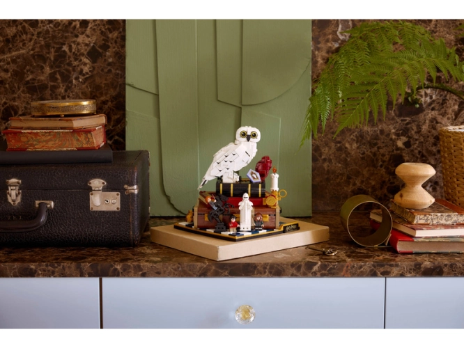 Postavte si první figurku LEGO Hedviky, sovice sněžné se složenými křídly, a vystavte si ji vedle kamene mudrců a na kufříku Harryho Pottera. Přidejte tři minifigurky LEGO Harry Potter – Harryho Pottera, Hermionu Grangerovou a Rona Weasleyho – a řadu předmětů, mezi které patří čokoládová žabka a kouzelnické šachy.