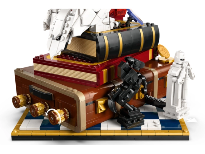- ZÁBAVNÉ FUNKCE – Otočením 3 koleček odejměte boční část kufru Harryho Pottera a odhalte filmovou scénu v mikroměřítku, otočte Hedvičinu hlavu nebo přesuňte královnu na kouzelnické šachovnici