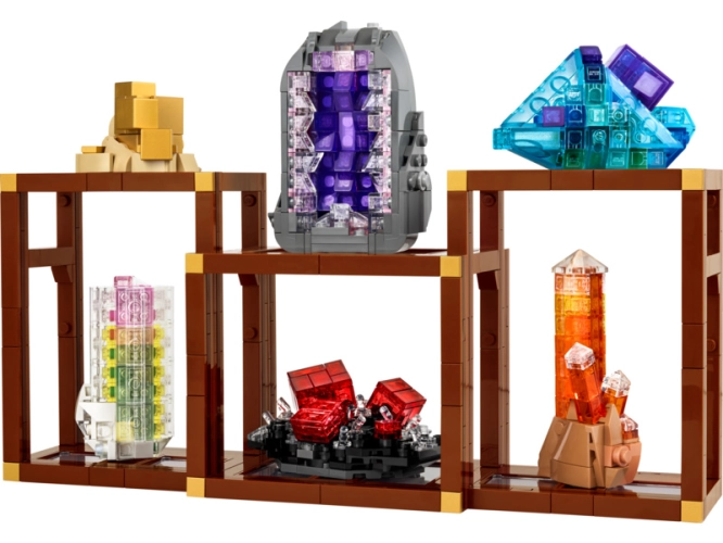 Pomocí chytrých stavitelských technik a průhledných kostek LEGO vytvořte model zlatého pyritu, fialového ametystu, modrého fluoritu, melounově zeleného turmalínu, červenorůžového rodochrozitu a oranžového křemene. Sestavte tři volně stojící police a umístěte na ně své výtvory, které pak můžete libovolně přestavovat.