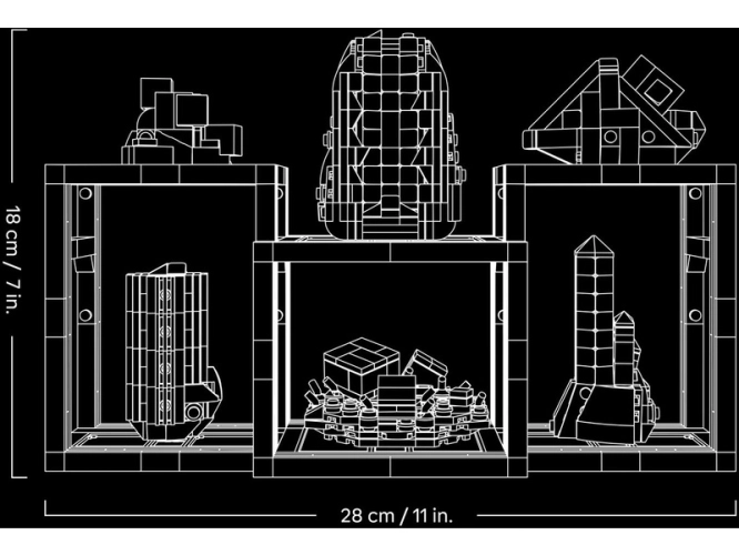 - Rozměry – Tento sběratelský model LEGO® se skládá z 880 dílků a měří přes18 cm na výšku, 28 cm na šířku a 7 cm do hloubky, když jsou všechny poličky umístěny vedle sebe