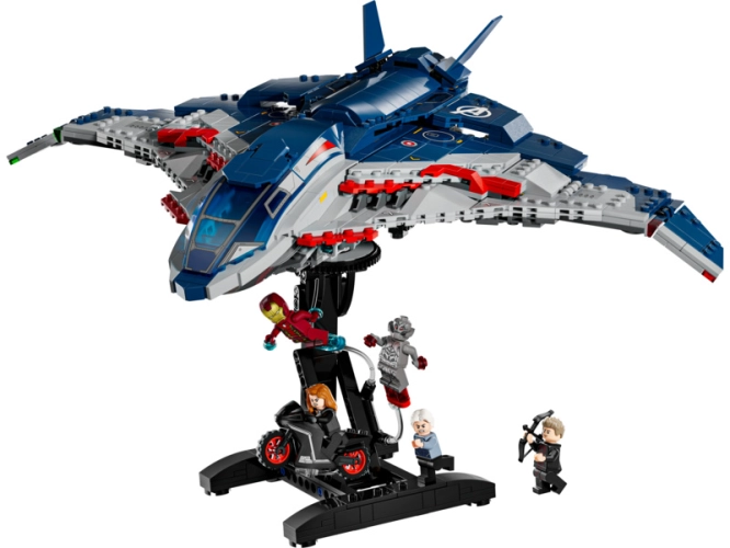 - Quinjet Avengers – Letadlo má otevírací kokpit, 2 vystřelovače vpředu, úložný prostor na zbraně a otevírací zadní dveře, aby děti mohly vjíždět a vyjíždět s motorkou