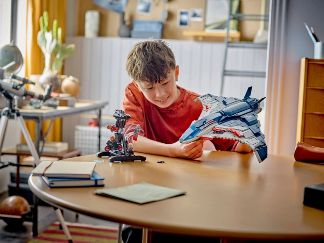 - Stavebnice pro děti z 1131 dílků – Hotový model stíhačky Quinjet měří přes 28 cm na výšku, 30 cm na délku a 45 cm na šířku