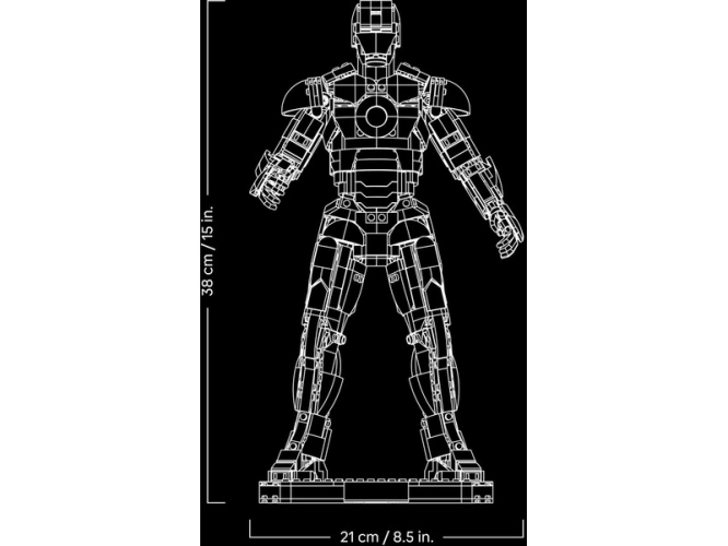 - ROZMĚRY – Stavebnice se skládá z 1 297 dílků a model Iron Mana měří přes 38cm na výšku, 21 cm na šířku a 11 cm do hloubky