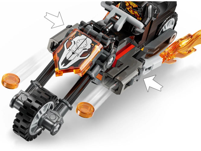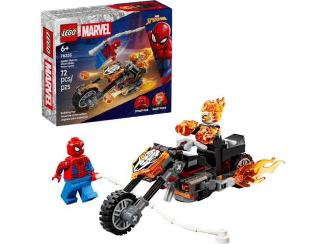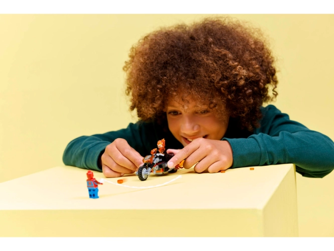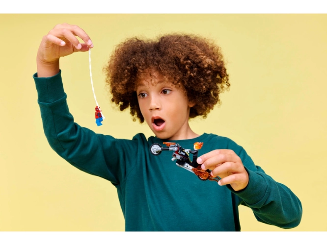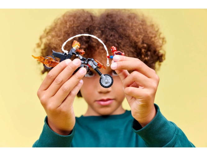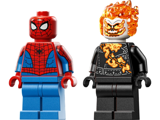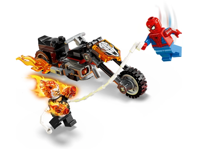 Ghost Rider je minifigurka kostlivce s plameny šlehajícími z rukou a hlavy. Jeho ikonická motorka má 2 hořící výfuky a 2 vestavěné vystřelovače. Připevněte pavučinové lano minifigurky Spider-Mana k motorce a užijte si nekonečné možnosti hraní – ať už s motorkou, nebo bez ní!