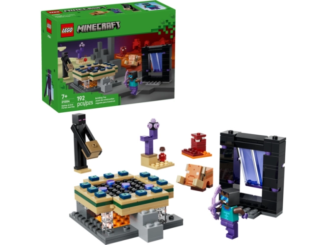 Vydejte se s milovníky Minecraftu na herní dobrodružství se stavebnicí Cesta portálem do Netheru a Endu (21584) pro kluky a holky od 7 let. Projděte portály, prozkoumejte modely jednotlivých biomů a vykročte vstříc dobrodružství s minifigurkou Cool hrdiny, figurkou Endermana a figurkou malého hoglina.