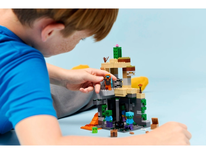 - HERNÍ STAVEBNICE – Tato stavebnice z pouštního biomu Minecraftu obsahuje spoustu kreativních prvků, které podněcují fantazii, jako je otočná komora, z níž se vynořují zombie, a posuvný díl, který spouští sesuv kamení