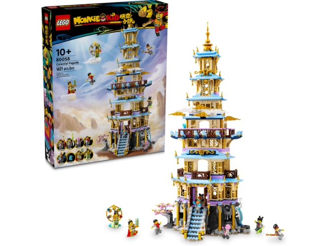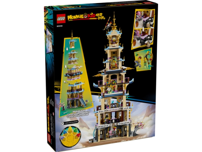Okouzlete fanoušky fantasy a děti od 10 let stavebnicí LEGO® Monkie Kid™ (80058) Nebeská pagoda plnou detailů, kterou si můžete postavit s celou rodinou. Parádní dárek obsahuje pagodu s 6 patry rozdělených do 4 částí, včetně vězení, knihovny, propracovaného trůnu v trůnním sále, místnosti ve věži se stojanem na barevný kámen a spoustu dalšího. Součástí stavebnice je také 7 minifigurek: Nüwa (s pokrývkou hlavy s barevným kamenem), Monkie Kid, Mei, Pigsy, pan Tang, Sandy, Li Jing, a navíc kocour Malý Mo.
