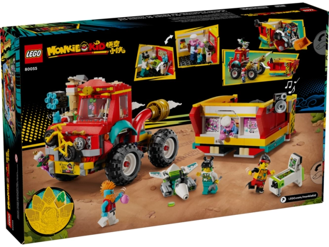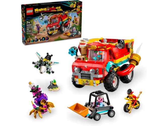 Darujte hrdinům a dobrodruhům od 7 let, kteří milují 5. řadu seriálu s Monkie Kidem, model dodávky týmu Monkie Kida (80055). Tato stavebnice z řady LEGO® Monkie Kid™ obsahuje dodávku s odnímatelnou korbou, otočné letadlo, bagr, akční minifigurky Monkie Kida, Mei, Sandy, Pigsyho, stookého démona a figurku kocoura Malého Mo. Dodávku pak přestavte na stánek s jídlem s odklápěcím grilem a otevíracím oknem. Nechybí ani malá kamenná stavba se zeleným kamenem a spousta inspirativních prvků pro nápadité hraní.