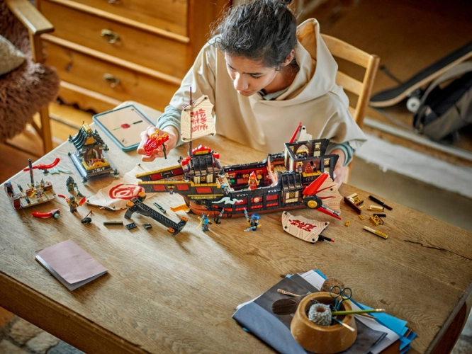 - Interaktivní stavebnice lodi – Fanoušci NINJAGO® můžou otáčet ozubeným kolem, pohybovat plachtami, odstraňovat střechy a podlahy, aby získali přístup do interiéru a sushi baru, složit stůl v hlavní kajutě a odhalovat tajemství