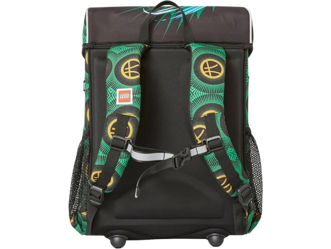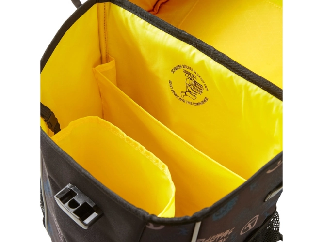 Uvnitř v hlavní kapse najdete nejen rozvrh hodin, ale taky přezku na klíče, na kterou lze připojit například i LEGO peněženku či LEGO kapsičku. EASY školní aktovka má pevné víko s plastovým zámkem, které jde snadno otevřít jednou rukou. K udržení stability aktovky v případě, že má otevřené víko, jsou na spodní straně vyztuženého dna umístěné plastové nožky, které zároveň aktovku chrání před špínou a vlhkem. Aktovka je vyrobena z materiálu odpuzujícího vodu a nečistoty, reflexní prvky jsou umístěné po všech stranách aktovky.