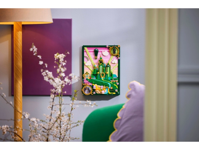 - Výstavní kousek na motivy filmu Wicked na zeď nebo na polici – Tato stavebnice se skládá z 1 518 dílků a měří přes 32 cm na výšku, 25 cm na šířku a 8 cm do hloubky