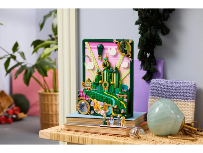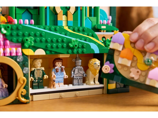 Tento umělecký dárek Wicked pro ženy, muže a dospělé fanoušky Wicked vdechne život filmovým momentům ve 3D podobě. V této pestrobarevné dekoraci najdete klíčová místa z filmu, včetně univerzity Shiz, Munchkinlandu a města Emerald City. Součástí je také Glindina bublina, kouzelný les a tajná schránka, ve které se ukrývají 4 postavy – minifigurky LEGO Dorotky Galeové, Zbabělého lva, Strašáka a Plecháče a řada dalších skrytých odkazů na film, které můžete objevit.