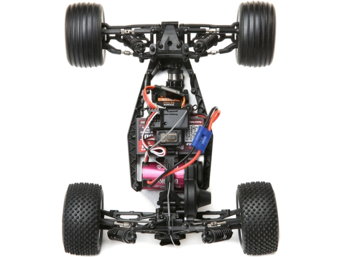 S autem Mini-T SB BL můžete závodit na zahradě nebo venku v terénu. Nenáročný a skladný model pro zábavu s přáteli, model má proporcionální ovládání, řízení je v modelu zajištěno mini servem Spektrum se servo saverem na výstupní hřídeli, k ovládání je přiložen vysílač v pásmu 2,4GHz a voděodolný 3-kanálový přijímač Horizon® 2.4Ghz. Model pohání výkonný motor Dynamite® 6000Kv s integrovaným regulátorem. Mini-T 2.0 je vybaven kuličkovými ložisky, která zvyšují výkonnost díky snížení tření hnacího ústrojí. Motor je ve středovém uspořádání pro lepší vyvážení, pro maximální traxi mají zadní pneumatiky kolíkový dezén, zatímco přední mají drážkovaný dezén pro lepší vedení směru.