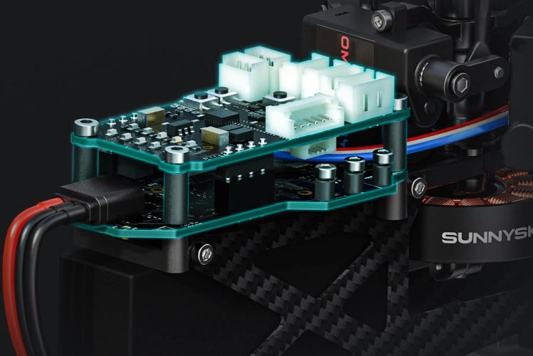 Tento zázrak leteckého inženýrství je řízen špičkovou letovou řídící jednotkou OFS3+ s integrovaným přijímačem ExpressLRS. Kromě toho OFS3+ umožňuje připojení přijímače systémů: