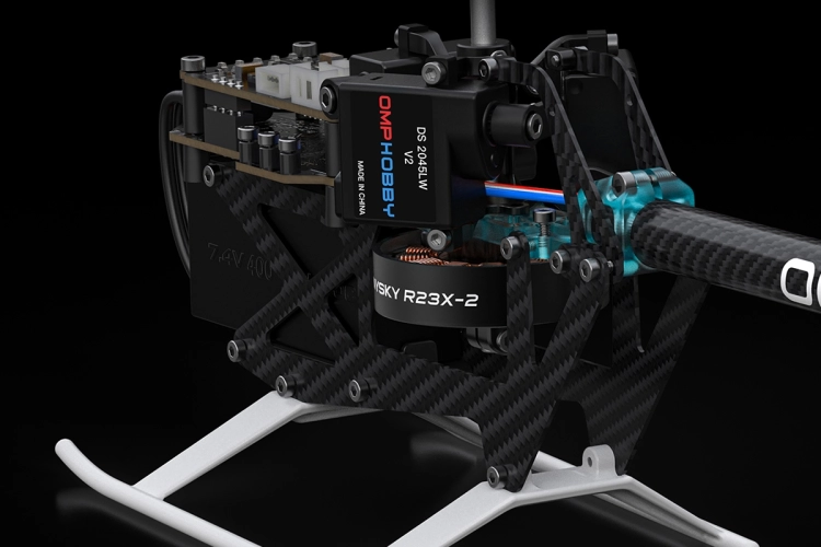 Konstrukce M1 V3 PRO byla kompletně přepracována, aby se snížila hmotnost, kdekoli je to možné, a zároveň se zachovala neuvěřitelná odolnost a výkonnost. Konstrukce rámu vychází z vrtulníků M2 V3, které se ukázaly jako extrémně lehké, ale při haváriích prakticky nezničitelné. Centrální hlavní deska tvoří páteř rámu a nese motor, lože serv s novými vylepšenými servy DS2045LW V2 a ocasní nosník, zatímco dva robustní uhlíkové panely poskytují montážní body pro podvozek, pohonný akumulátor a letovou řídící jednotku OFS3+ s regulátorem. Podobně jako u jeho větších bratříčků je trup v zadní části vybaven výztužnými deskami, které přesměrovávají síly při havárii a zvyšují tak pravděpodobnost, že klíčové komponenty přežijí. Všechny šrouby na M1 V3 PRO jsou výhradně imbusové 1,3 mm a 1,5 mm. Už nejsou potřeba žádné speciální nástroje, žádné kompromisy, k údržbě a opravám celého vrtulníku potřebujete pouze dva standardní imbusové šroubováky.