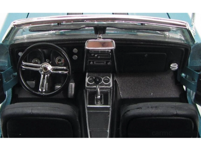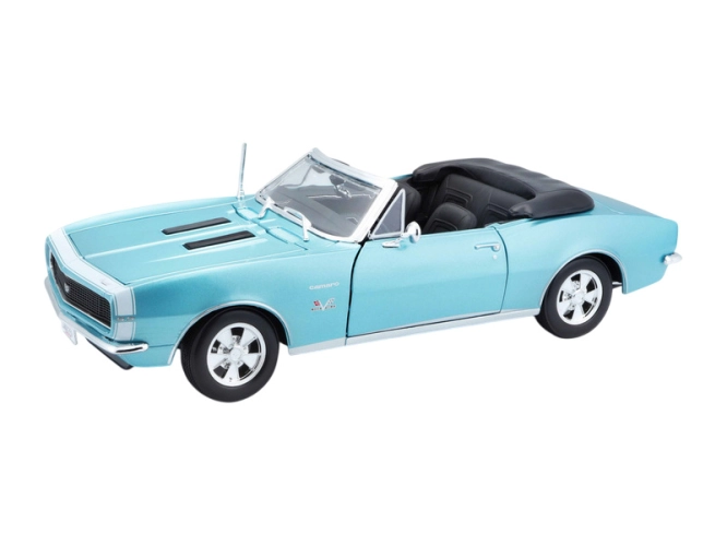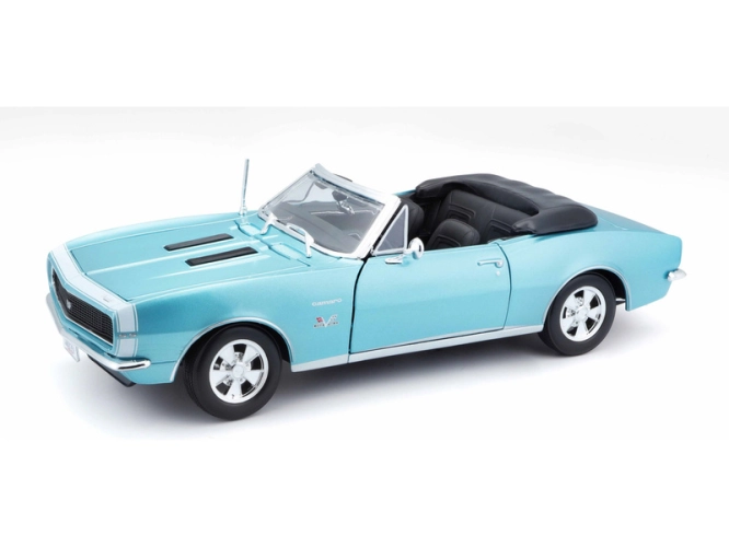Kovový model auta 1:18 Maisto 31684GN Chevrolet Camaro SS 396 1967, nejen pro sběratele. Model je skládací, v detailním provedení a má otevíratelné dveře. Barva modelu je tyrkysová a je přibližně 25,5 cm dlouhý. U modelu lze otáčet volantem koly, otevřít dveře, víko motoru a kufru.