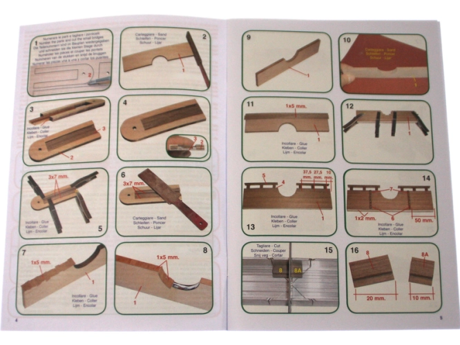 Po otevření víka krabice naleznete dřevěné díly modelu z překližky, lišty, drobné součásti v plastových sáčcích a manuál.