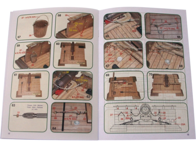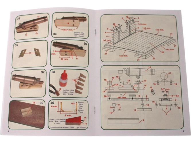 Balení obsahuje laserem vyřezávané dřevěné díly, kovové odlitky, hlaveň, obrázkový návod ke stavbě.