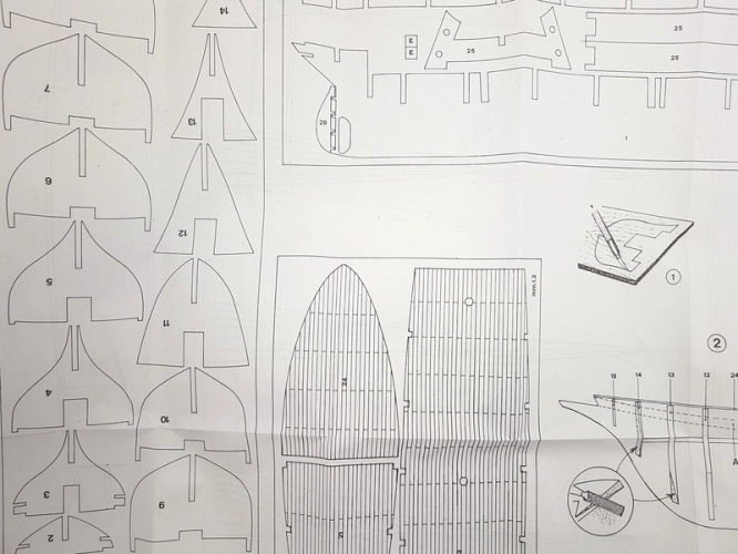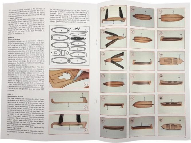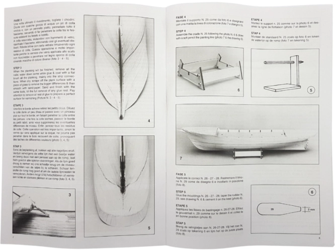Po otevření víka krabice naleznete uspořádané překližkové díly, lišty a stožáry jsou svázány ve svazcích, drobné díly jsou baleny v uzavíratelných sáčcích.