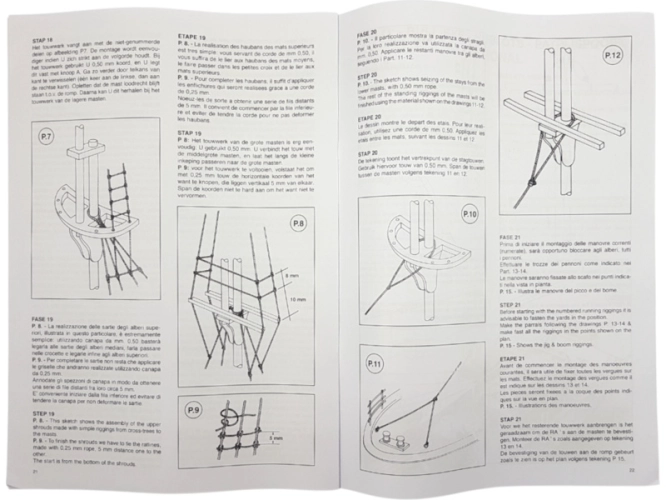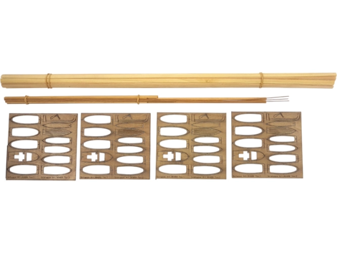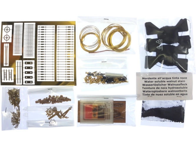 Balení obsahuje laserem řezané dřevěné díly, plaňky, paluby, stožáry, lanoví, kovové a dřevěné díly, mosazné odlitky, mosazné fotolepy a vlajku. Stavební plány, manuál.