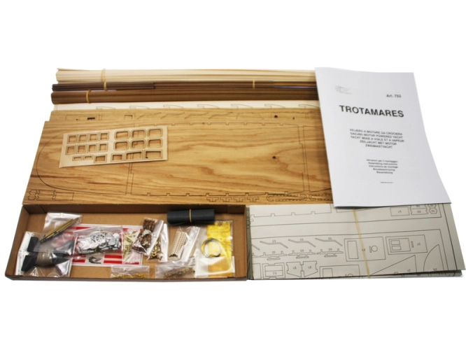 Stavebnice neplovoucího modelu jachty Mantua Model Trotamares v měřítku 1:47 a délce 800 mm, která byla postavena ve Španělsku v roce 1958. Dnes kotví v docích Montecarlo nebo se plaví v tyrkysových vodách Francouzské riviéry. Kit obsahuje dřevěné díly, kovové odlitky dekorací a podrobné stavení plány.