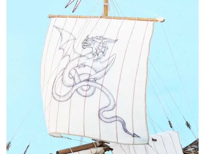 Stavebnice modelu Vikingské lodi Dreki v měřítku 1:40 od Mantua Model. Délka modelu lodi je 600 mm, stavba převážně ze dřeva s řadou doplňků, součástí je stavební plán a manuál s mnoha podrobnými obrázky.