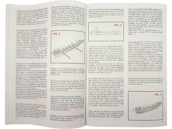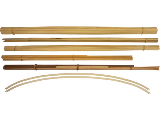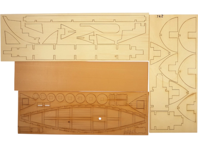 Po otevření víka krabice naleznete uspořádané překližkové díly, lišty a stožáry jsou svázány ve svazcích, drobné díly jsou baleny v blistru.