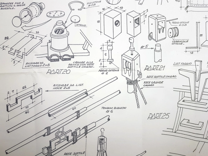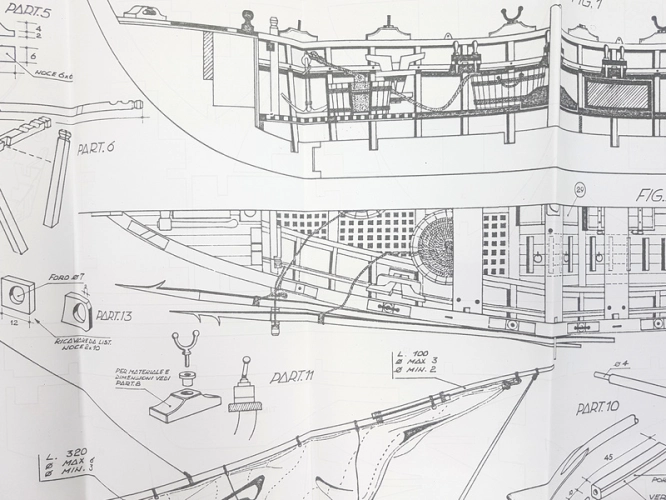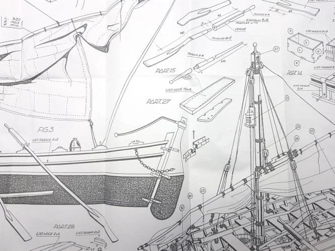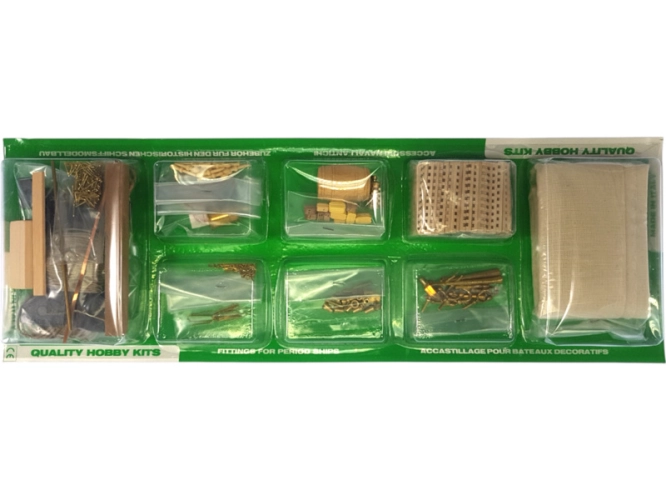 Balení obsahuje laserem řezané dřevěné díly, plaňky a lišty, stožáry, lanoví, plachtovinu, drobné dřevěné díly, mosazné odlitky a kovové díly. Stavební plány, manuál.