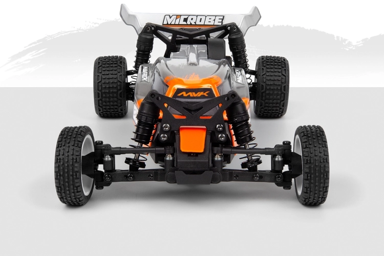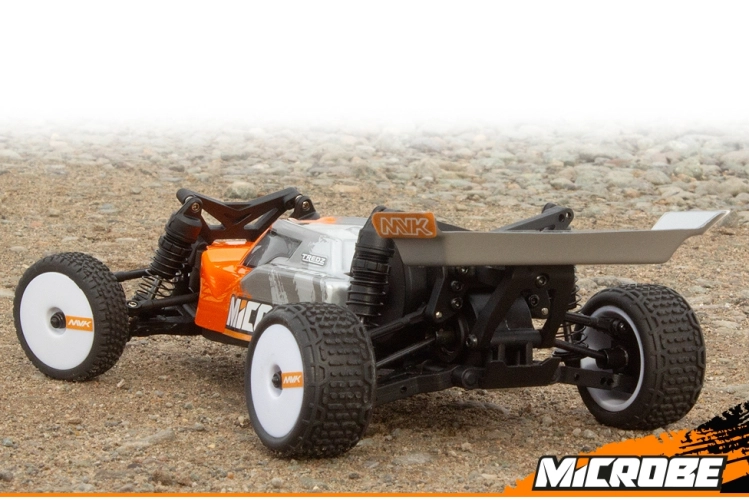 Elegantní 1,5 mm eloxované hliníkové plato podvozku, osazení kuličkovými ložisky a plynulá 3kolová zadní převodovka společně dodávají modelu Microbe stabilní a přesný pocit z jízdy. Přidejte olejové tlumiče a odvětrávaná kola s pěnovými vložkami a získáte malou buggy, která miluje zatáčky, pohlcuje nerovnosti a s jistotou vystřeluje ze zatáček.