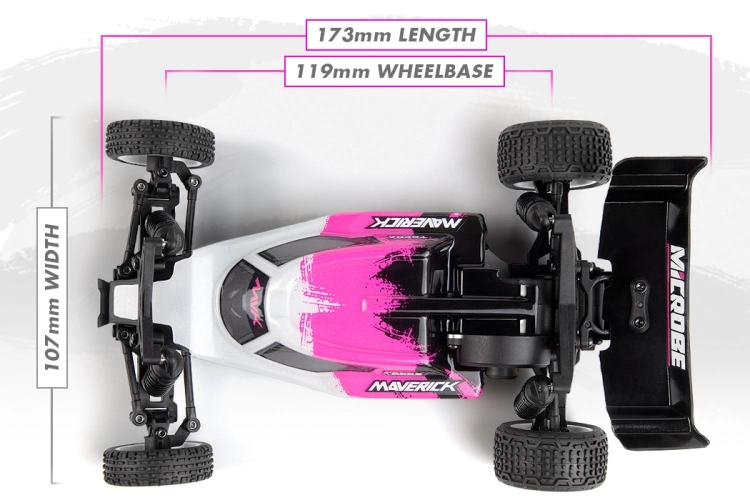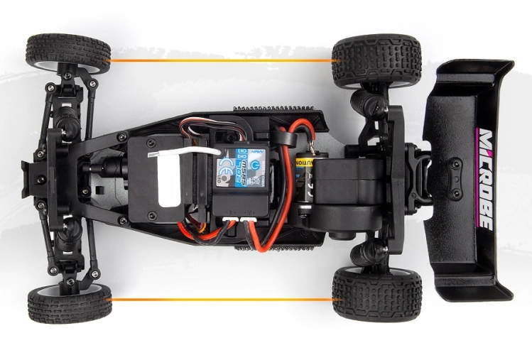 Elegantní 1,5 mm eloxované hliníkové plato podvozku, osazení kuličkovými ložisky a plynulá 3kolová zadní převodovka společně dodávají modelu Microbe stabilní a přesný pocit z jízdy. Přidejte olejové tlumiče a odvětrávaná kola s pěnovými vložkami a získáte malou buggy, která miluje zatáčky, pohlcuje nerovnosti a s jistotou vystřeluje ze zatáček.