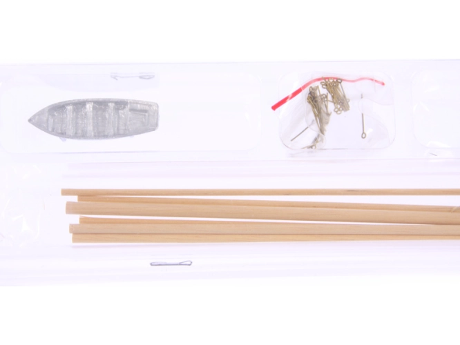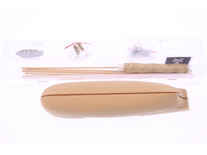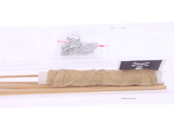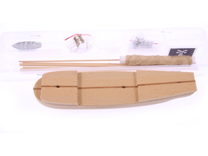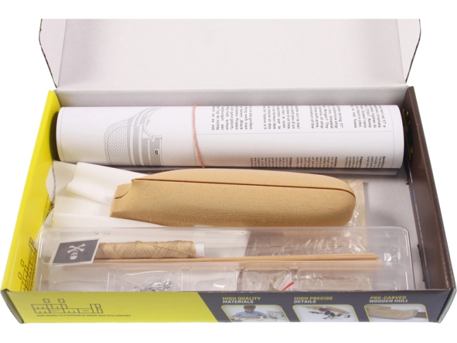 Balení obsahuje hotový polotovar trupu, překližkové díly (včetně dílů na stojánek lodi), dřevěné lišty, blistr s drobnými díly, sadu výkresů a podrobný návod ke stavbě v angličtině.