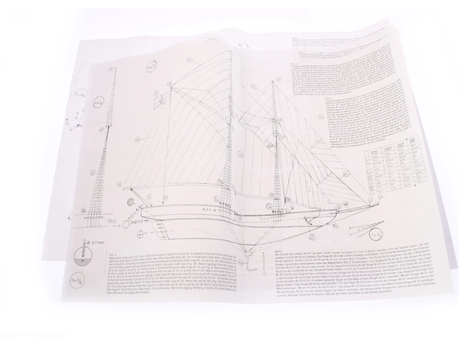 Po otevření víka krabice naleznete dřevěné díly modelu, drobné součásti uzavřené v plastovém průhledném blistru a sadu výkresů.