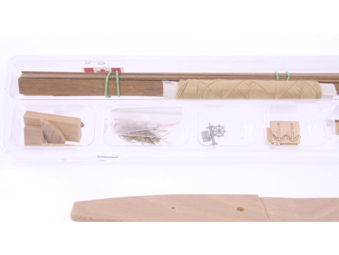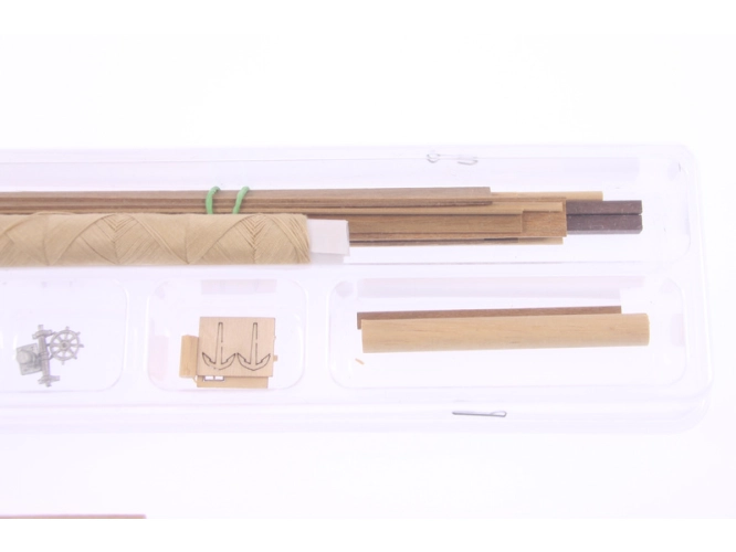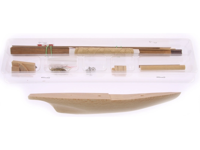 Balení obsahuje hotový polotovar trupu, překližkové díly, dřevěné lišty, blistr s drobnými díly, sadu výkresů a návod.