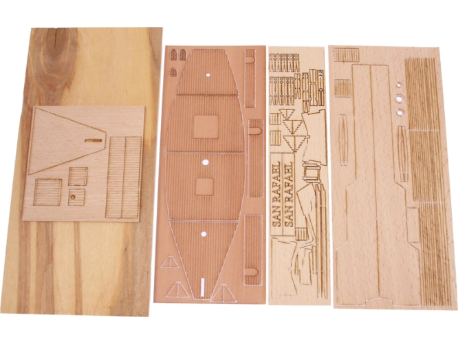 Po otevření víka krabice naleznete dřevěné díly modelu, drobné součásti uzavřené v plastovém průhledném blistru a sadu výkresů.
