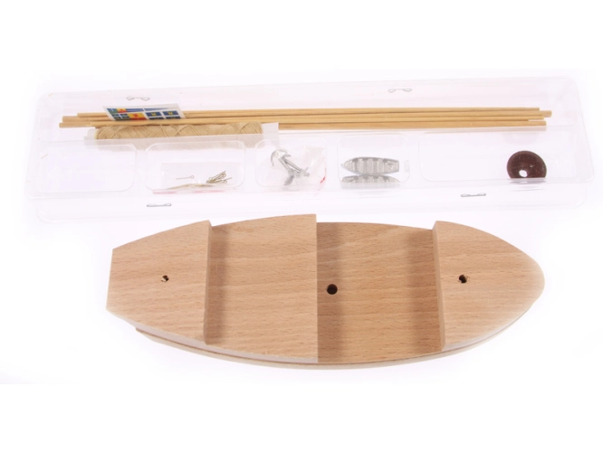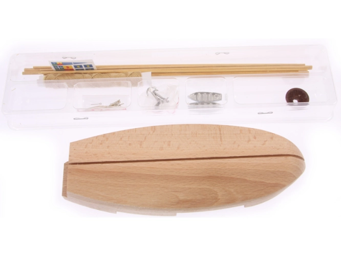 Balení obsahuje hotový polotovar trupu, překližkové díly, dřevěné lišty, blistr s drobnými díly, sadu výkresů a návod CZ.