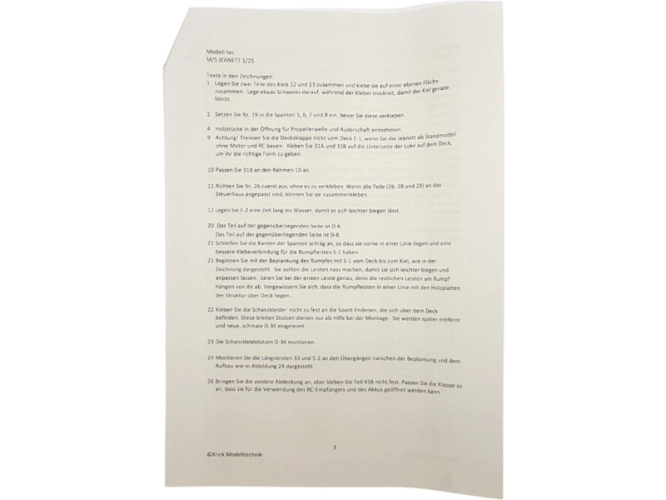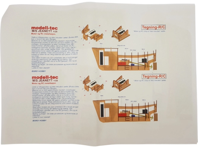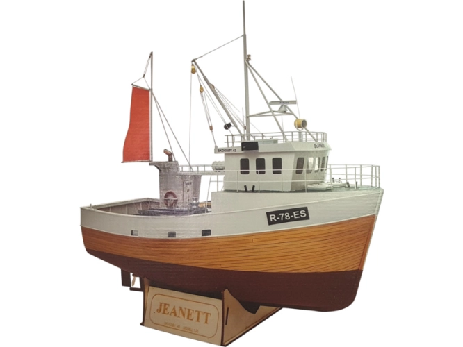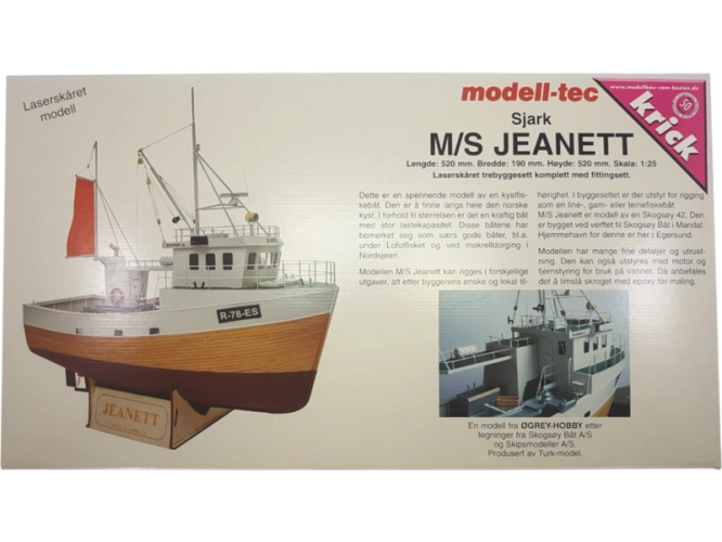 Stavebnice modelu lodi Modell-Tec MS Jeanett 1:25 kit, s množstvím detailů. Toto norské rybářské plavidlo lze sestavit, jako neplovoucí model, nebo jej můžete osadit RC výbavou a vypustit na hladinu. Stavba převážně ze dřeva, laserem řezané díly, mosazné fotolepy, detaily z 3D tisku. Obrázkový návod.
