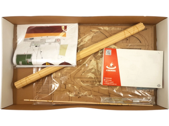 Po otevření víka krabice naleznete dřevěné díly modelu z překližky, sadu lišt, drobné součásti uzavřené v sáčcích a obrázkový návod.